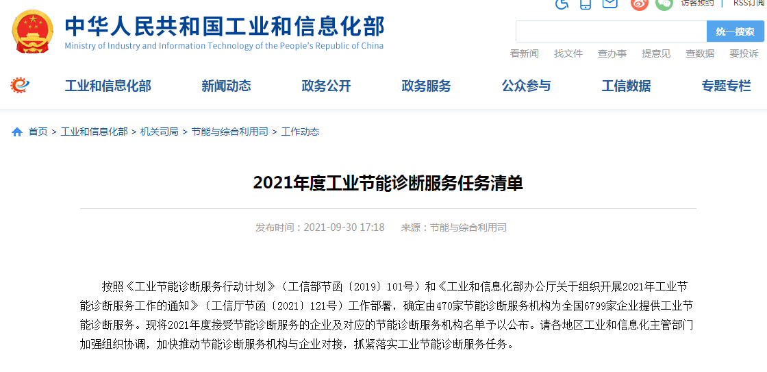 根據(jù)2021年9月30日,國家工業(yè)和信息化部《工業(yè)節(jié)能診斷服務(wù)行動計劃》(工信部節(jié)函〔2019〕101號)和《工業(yè)和信息化部辦公廳關(guān)于組織開展2021年工業(yè)節(jié)能診斷服務(wù)工作的通知》(工信廳節(jié)函﹝2021﹞121號)工作部署。