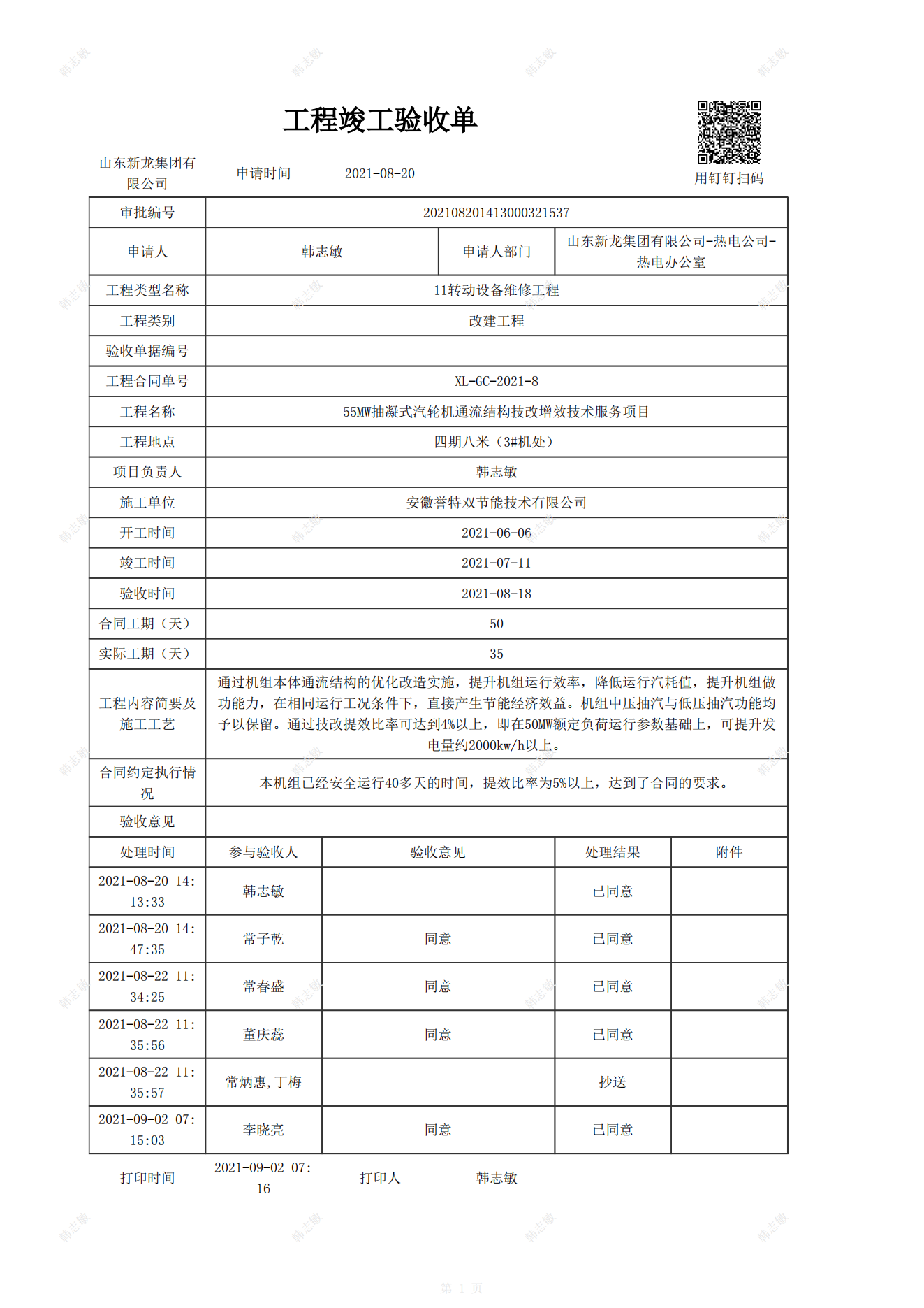 喜訊——山東新龍集團(tuán)55MW抽凝式汽輪發(fā)電機(jī)組通流改造節(jié)能提效EPC項(xiàng)目順利通過工程驗(yàn)收