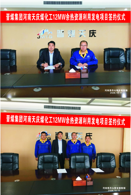 2020年10月12日上午,公司順利簽訂中國(guó)五百?gòu)?qiáng)晉煤集團(tuán)天慶煤化工余熱余壓資源綜合利用12MW發(fā)電項(xiàng)目。
