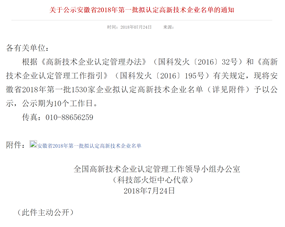 2018年7月24日,國(guó)家科技部全國(guó)高新技術(shù)企業(yè)認(rèn)定管理工作領(lǐng)導(dǎo)小組辦公室,通過科技部火炬中心官網(wǎng)發(fā)布——安徽省2018年第一批國(guó)家級(jí)高新技術(shù)企業(yè)認(rèn)定名單的公示通知,我公司安徽譽(yù)特雙節(jié)能技術(shù)有限公司榜上有名,目前已順利通過公示,正式予以認(rèn)定,公司在此表示熱烈祝賀!