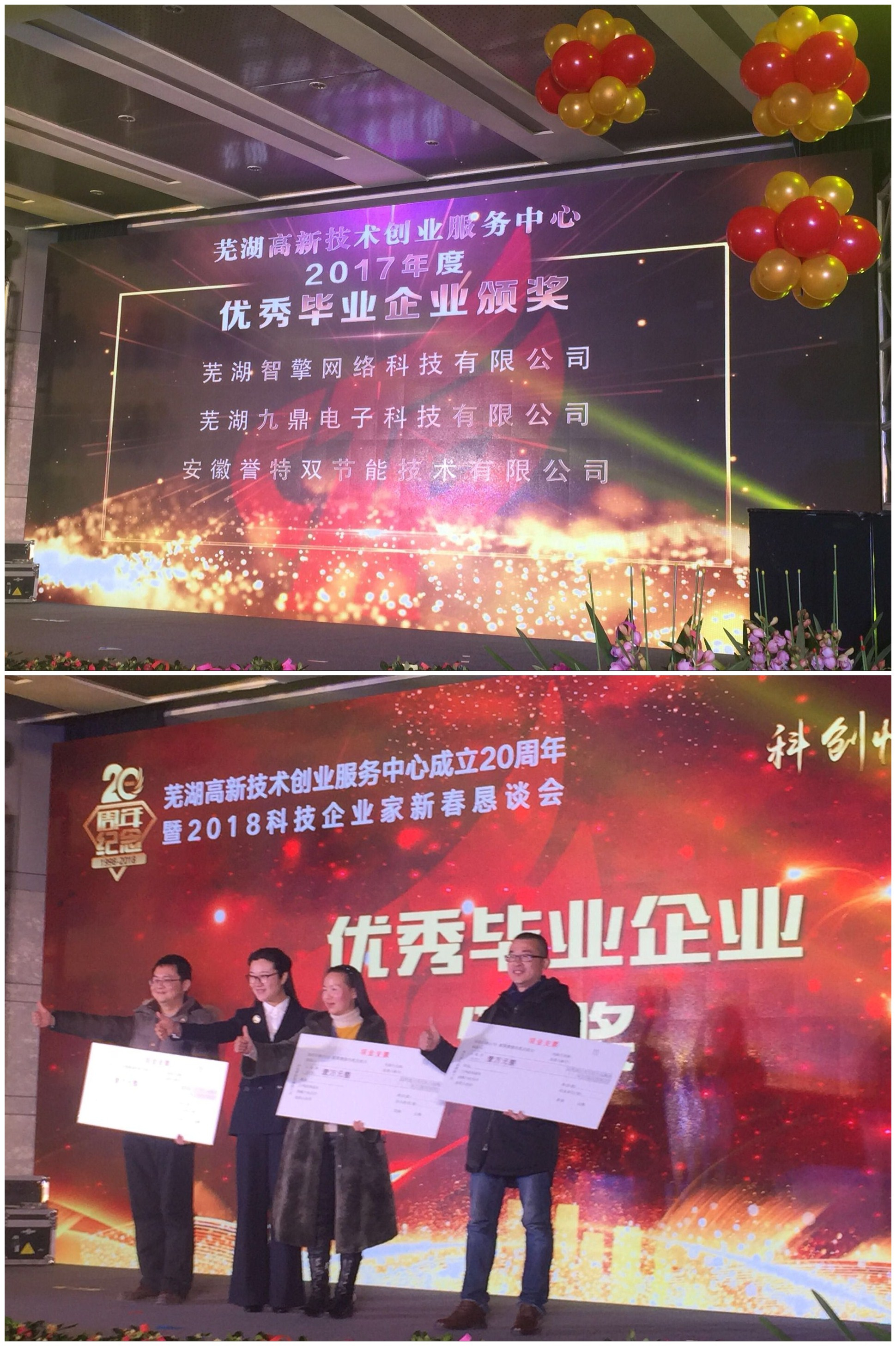 近日,我公司安徽譽(yù)特雙節(jié)能技術(shù)有限公司,榮獲蕪湖市國(guó)家級(jí)高新技術(shù)創(chuàng)業(yè)園區(qū)“2017年優(yōu)秀畢業(yè)創(chuàng)業(yè)企業(yè)”榮譽(yù)稱號(hào)。