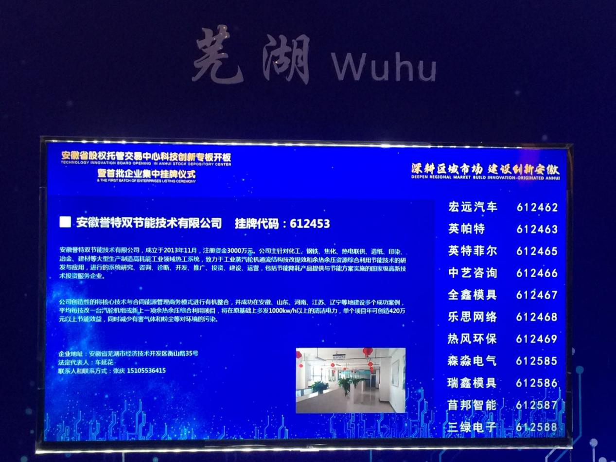 4月24日上午,安徽省股權(quán)托管交易中心科技創(chuàng)新專板開板暨首批企業(yè)集中掛牌儀式在合肥市隆重舉行,全省首批掛牌企業(yè)787家,譽(yù)特雙公司榮耀成為首批掛牌企業(yè)之一,股票代碼:612453。