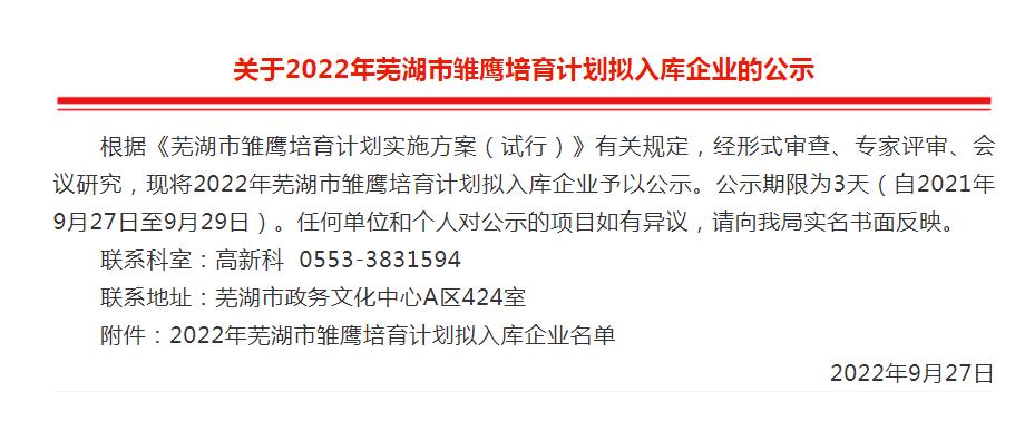 喜訊——公司入選2022年蕪湖市雛鷹培育計(jì)劃名單