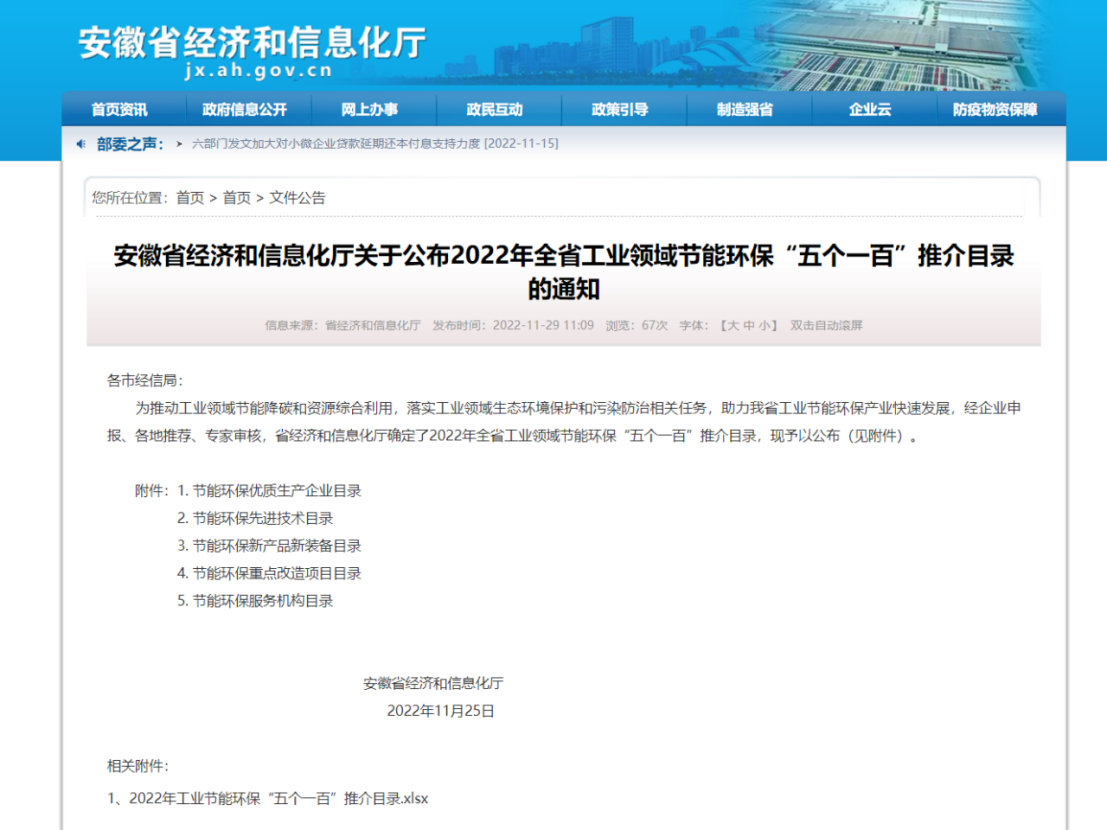 2022年11月25日,安徽省經(jīng)信廳發(fā)布2022年度全省工業(yè)領(lǐng)域節(jié)能環(huán)保產(chǎn)業(yè)“五個一百”推介目錄,我公司三個項目喜獲認(rèn)定。
