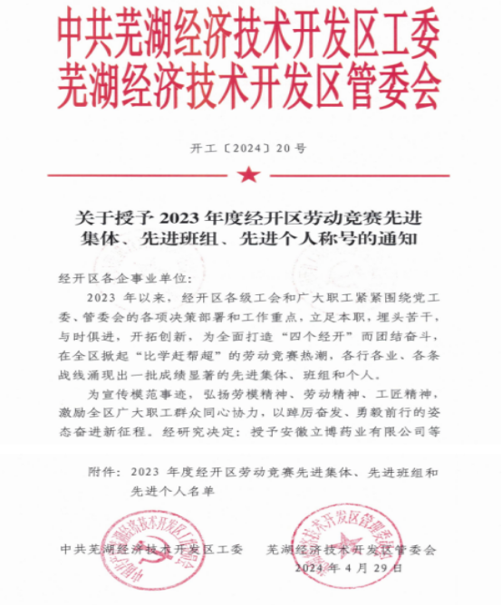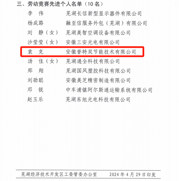 2024年4月29日,中共蕪湖經濟技術開發(fā)區(qū)工委、蕪湖經濟技術開發(fā)區(qū)管委會發(fā)布《關于授予2023年度經開區(qū)勞動競賽先進集體、先進班組、先進個人稱號》通知文件,我公司總經理袁克榮獲“先進個人”榮譽稱號,在此表示熱烈祝賀。