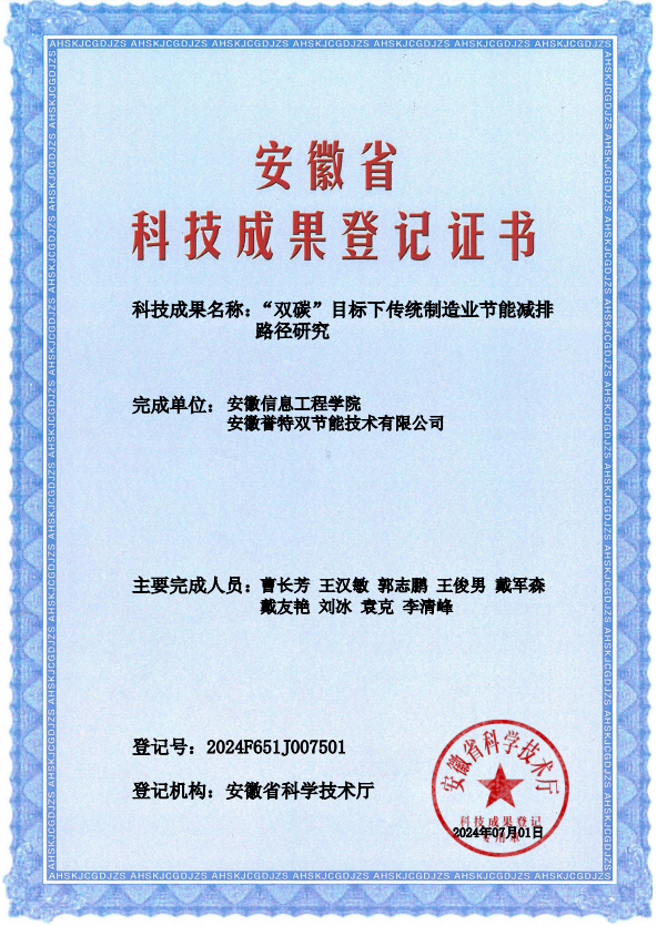 近日,我公司與安徽信息工程學(xué)院聯(lián)合研發(fā)的科技成果--“雙碳目標(biāo)下傳統(tǒng)制造業(yè)節(jié)能減排路徑研究”通過安徽省科學(xué)技術(shù)廳登記認證,并發(fā)布登記證書。
