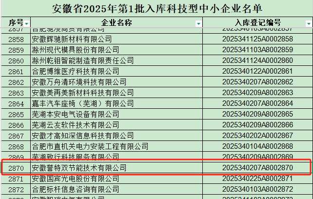 近日,安徽省科學(xué)技術(shù)廳公布了2025年第一批入庫(kù)科技型中小企業(yè)名單,安徽譽(yù)特雙節(jié)能技術(shù)有限公司憑借其在節(jié)能技術(shù)領(lǐng)域的突出創(chuàng)新實(shí)力和豐富的技術(shù)積累,入選科技型中小企業(yè)庫(kù),成為安徽省科技創(chuàng)新主力軍中的一員。
